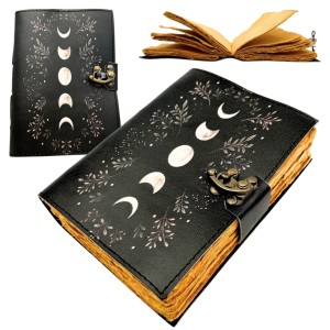 Elegancki notes skórzany retro z motywem faz księżyca. Wykonany z czarnej skóry koziej, posiada 200 stron grubego papieru 150 GSM. Idealny na prezent i dziennik.