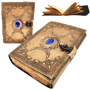 Magiczny notes skórzany z niebieskim kamieniem i symbolem Triple Moon. Ręcznie wykonany ze skóry bawolej, posiada 200 stron papieru vintage. Idealny na prezent.
