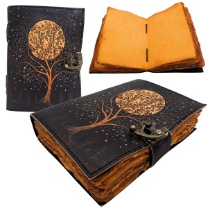 Ręcznie wykonany notes vintage z koziej skóry z motywem drzewa i księżyca. 200 stron grubego papieru – idealny na notatki, szkice, myśli i podróże.