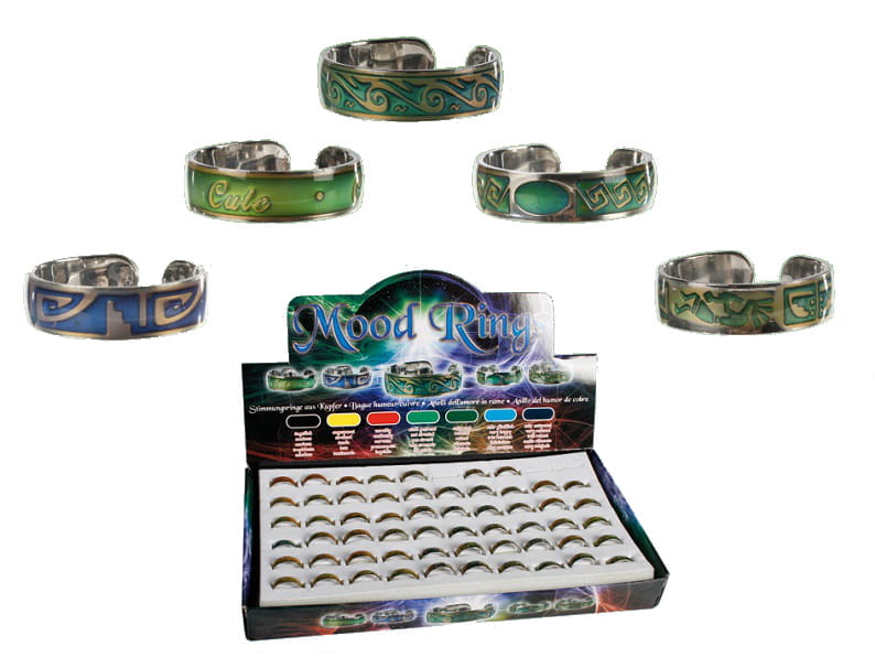 Obrączka z kolorowym wzorem graficznym, który w zależności od nastroju osoby, która go nosi, zmienia swoje kolory. i tak: czarny oznacza zaniepokojenie, żółty oznacza napięcie, czerwony oznacza obawianie się, limonkowy oznacza brak stresu, zielony oznacza zrelaksowanie, jasny niebieski oznacza duże szczęście, zaś ciemny niebieski oznacza duże zrelaksowanie. Dostępne są różne wzory. Wysyłamy jako mix wzorów.
