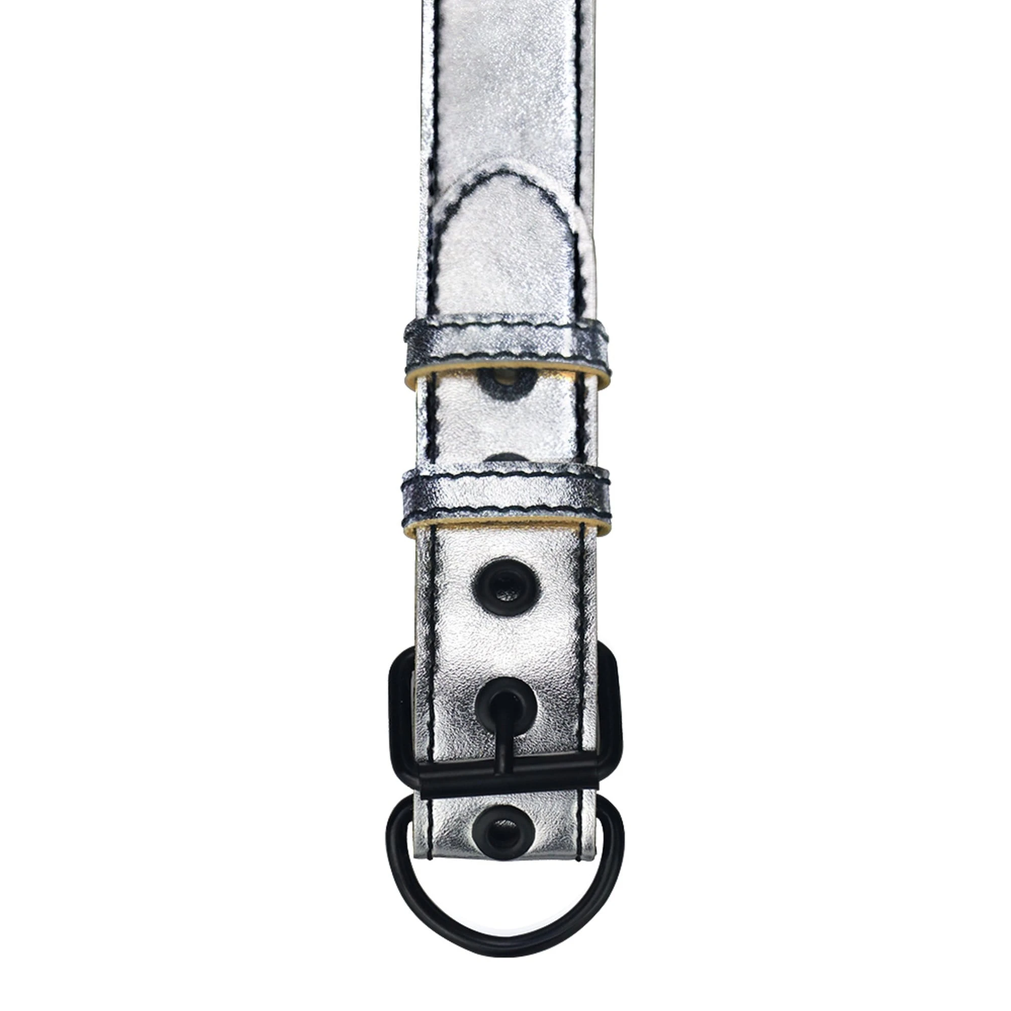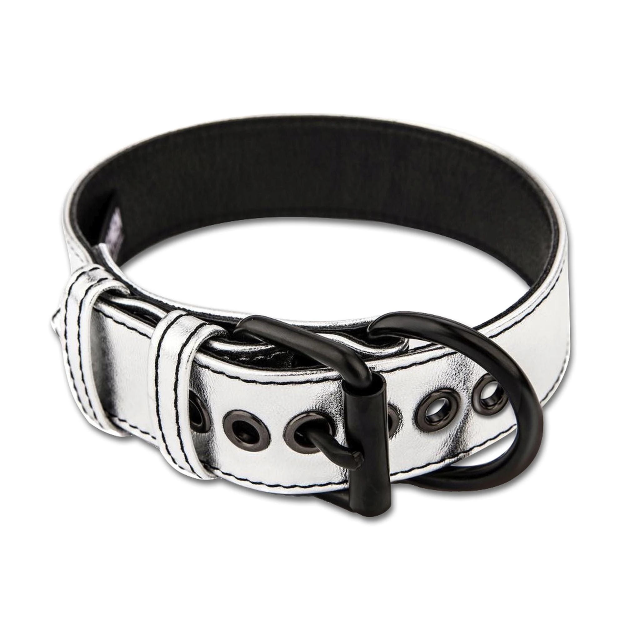 Stylowy zestaw składający się z obroży i smyczy wykonanych ze sztucznej skóry, które cechuje czarne metaliczne wykończenie. Dwa skórzane uchwyty na pasek zapobiegają trzepotaniu końca paska, zapewniając tym samym większą wygodę podczas noszenia. Obroża jest plastyczna i nie wymaga specjalnej pielęgnacji, co odróżnia ją od prawdziwej skóry. Zapięcie na klamrę umożliwia regulację obwodu w zakresie od 14 do 18,5 cala, dzięki czemu jest odpowiednia zarówno dla mężczyzn, jak i kobiet.