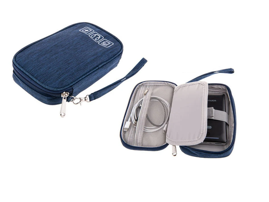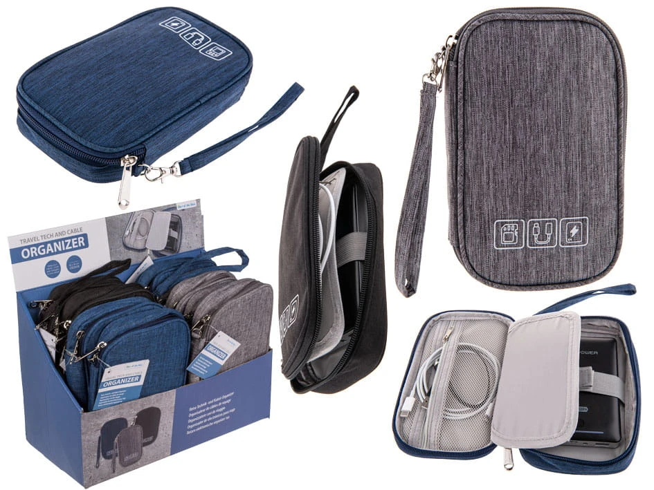 Gustowny organizer do akcesoriów telefonicznych, uporządkuje kable, jest w nim miejsce na powerbank, ładowarkę i inne gadżety telefoniczne. Wszystko w jednym miejscu, nie zgubi się i będzie odpowiednio zabezpieczone. Organizer w formie saszetki zasuwanej na suwak. W środku zasuwana kieszonka siatkowa, przegródka z dwiema małymi kieszonkami i miejsce na powerbank. Dostępne trzy kolory, sprzedajemy jako mix.