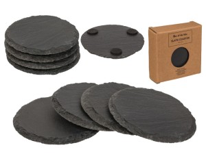 Zestaw 4 podkładek pod kubki z kamiennego łupka. Są zarówno użyteczne, jak i bardzo dekoracyjne. To powrót do natury, zachowują bowiem kolor i strukturę kamienia. Charakteryzują się oryginalnymi, nieoszlifowanymi krawędziami i chropowatą powierzchnią.