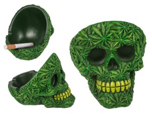Popielniczka wykonana z poliresinu w kształcie czachy. Na powierzchni czaszki motyw dekoracyjny - liść marihuany. Dodatkowo popielniczka posiada specjalną podstawkę, które zapobiega rysowaniu stołu. Ciekawy gadżet dla palaczy i wielbicieli mrocznych klimatów.