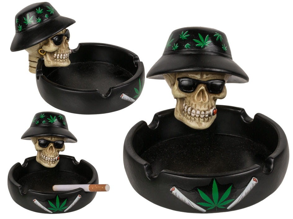 Stylowa popielniczka w kształcie czaszki z motywem liścia marihuany to oryginalny gadżet dla osób ceniących niebanalne dodatki. Doskonale sprawdzi się jako praktyczny element wyposażenia i dekoracyjna ozdoba wnętrza.