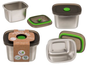 Pudełko do przechowywania żywności o pojemności 450 ml. Pudełko wykonane ze stali nierdzewnej. Posiada szczelną pokrywkę. Można myć w zmywarce. Nie można używać w mikrofalówce.