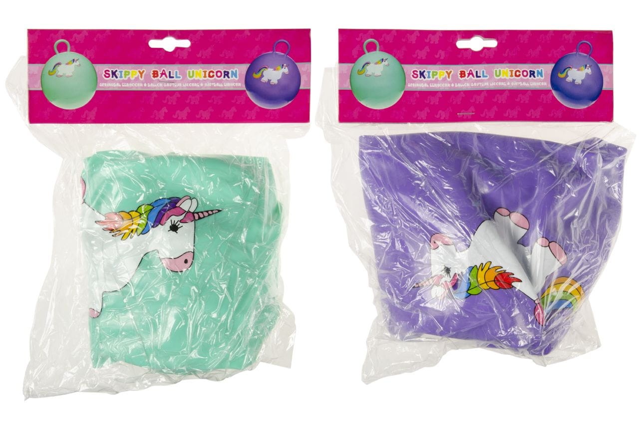 Grafika na Skippy Ball przedstawia jednorożca. Kolorowe motywy i radosne wzory sprawiają, że piłka jest atrakcyjna wizualnie dla dzieci i dodają dodatkowej radości podczas użytkowania.