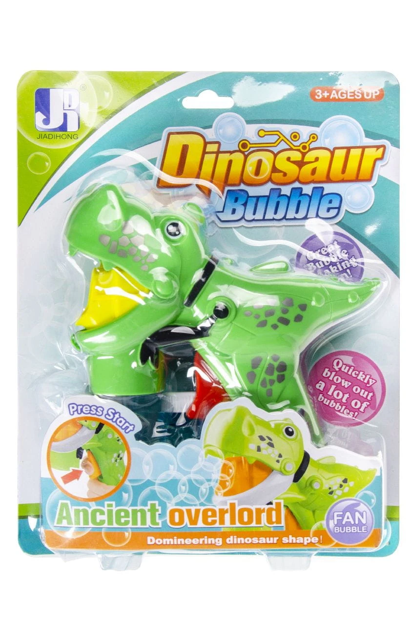 Pistolet do robienia baniek mydlanych w kształcie dinozaura. Zestaw składa się z plastikowego pistoletu i 2 pojemników z płynem do robienia baniek. Wystarczy wkręcić pojemniczek do pistoletu, nacisnąć spust, a z lufy wydobędą się mydlane bańki. Świetna zabawa dla całej rodziny. .
