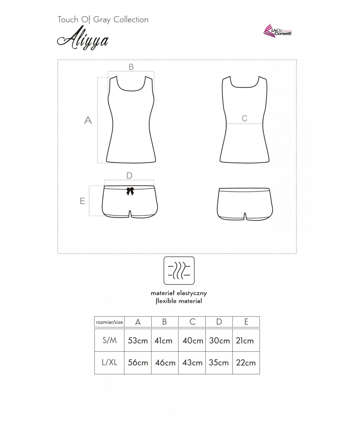 Komplet składa się z koszulki bez rękawków i krótkich spodenek. Krótkie spodenki są luźne, z elastycznym ściągaczem w pasie, co zapewnia idealne dopasowanie do figury. Całość prezentuje się bardzo atrakcyjnie i stanowi doskonały wybór dla każdej kobiety, która ceni sobie wygodę podczas snu.