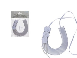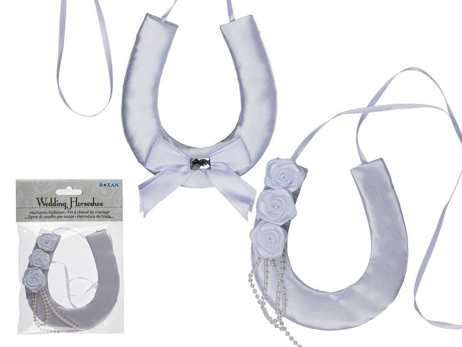 Dekoracja ślubna, która sprawia, że sala lub stoły prezentują się jeszcze o wiele bardziej okazale. Warto zadbać o takie szczegóły dekoracji, aby zdjęcia i atmosfera była pięknie weselna. Podkowa w białym kolorze do zawieszenia na białej wstążce (w zestawie). Podkowa o wymiarach około 12 x 11 cm. Wysyłamy jako mix 2 wzorów.