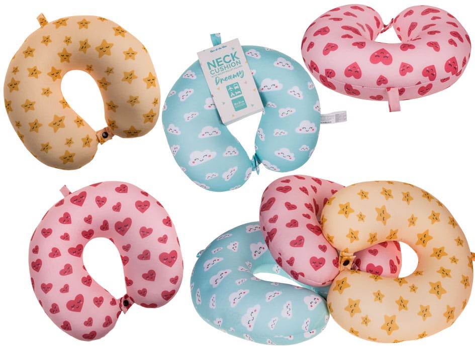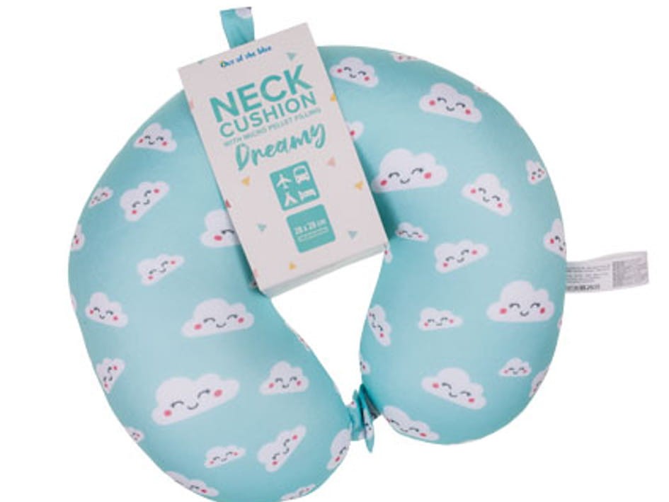Miękka i przyjemna w dotyku poduszka wypełniona malutkimi kuleczkami. Poduszka ta ma za zadanie pomóc w rozluźnieniu mięśni szyi po ciężkiej pracy lub w czasie długiej podróży. Dodatkowo, posiada zapięcie na napę, które umożliwia wygodne zapięcie pod szyją i zapobiega zsuwaniu się poduszki podczas wypoczynku. Produkt ten ma również zawieszkę, dzięki której można ją powiesić w dowolnym miejscu. Poduszka jest szczególnie przydatna podczas podróży samochodem. Składa się z 85% poliestru i 15% elastanu, a waga granulatu wynosi około 100g