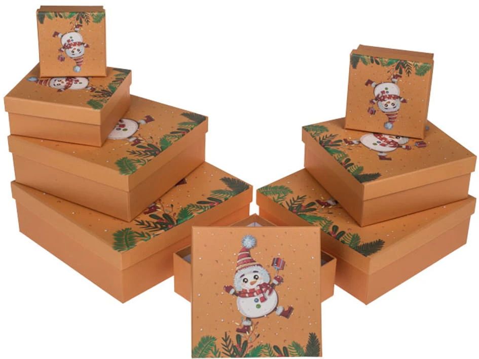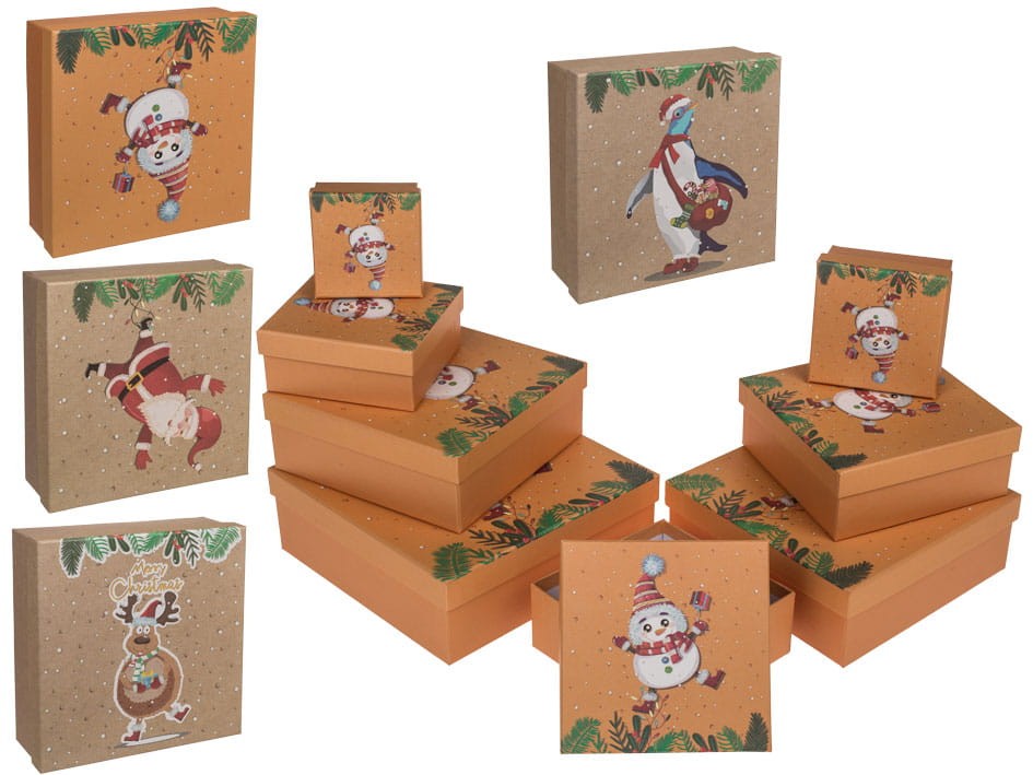 Każdy zestaw zawiera osiem pudełek. Twarde pudełeczka idealnie nadające się na pakowanie prezentów. Każde kolejne pudełko jest włożone w poprzednie. Idealne na pakowanie prezentów zarówno świątecznych jak i urodzinowych. Wymiar pierwszego 22 x 22 x 8 cm, kolejne powoli się zmniejszają.