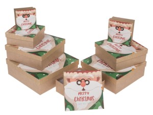 Każdy zestaw zawiera osiem pudełek. Twarde pudełeczka idealnie nadające się na pakowanie prezentów. Każde kolejne pudełko jest włożone w poprzednie. Idealne na pakowanie prezentów zarówno świątecznych jak i urodzinowych. Wymiar pierwszego 22 x 22 x 8 cm, kolejne powoli się zmniejszają.