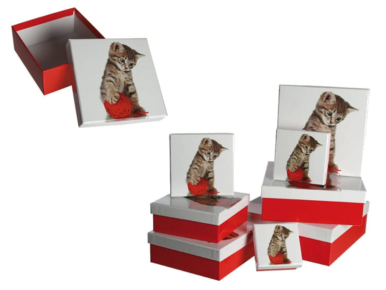 Zestaw ośmiu dekoracyjnych pudełek prezentowych zdobionych grafiką kota.
