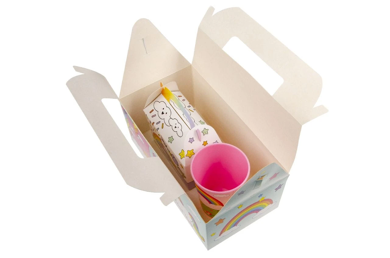 Kartonowe składane pudełko na przekąski, smakołyki lub też inne niespodzianki, którymi możemy obdarować zwłaszcza dzieci, ale również inne osoby. Składane, będzie świetną ozdobą i opakowaniem niespodzianki lub też smakołyków. Przydatny na festyny, uroczystości szkolne, przyjęcia z prezentami, imprezy firmowe.