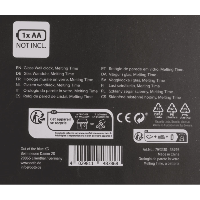 Zasilany jedną baterią AA (niedołączoną), zegar jest nie tylko efektowny, ale i praktyczny. Jego lekka konstrukcja oraz gotowe opakowanie sprawiają, że idealnie sprawdza się jako prezent – dla dekoratorów, artystów, marzycieli lub każdego, kto ceni nieszablonowy design.