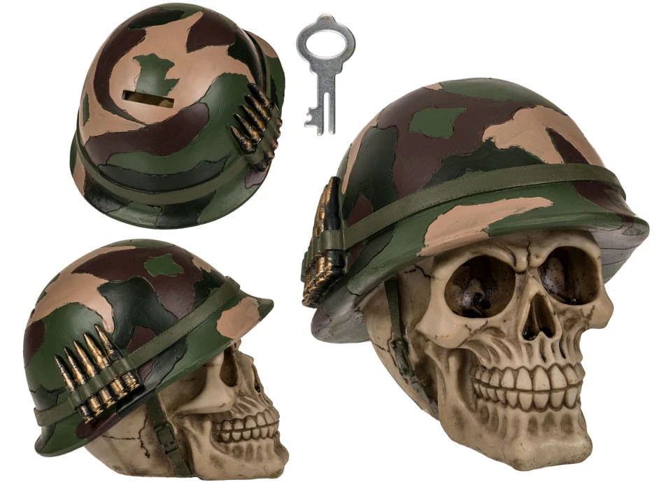 Bardzo mocna skarbonka, która na pewno zrobi wrażenie na każdym znajomym. Świetny element wystroju pokoju każdego miłośnika wojska i żołnierskich klimatów. Bardzo realistyczna czaszka w żołnierskim hełmie z nabojami.