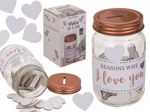 Super gadżet dla zakochanych. Słoik , do którego można wrzucać serduszka z zapisanymi miłosnymi deklaracjami. W komplecie 50 serduszek, na których można pisać, np markerami czy flamastrami. Super pomysł na prezent dla młodych par, zakochanych, narzeczonych. Przechowany będzie wspaniałą pamiątką.