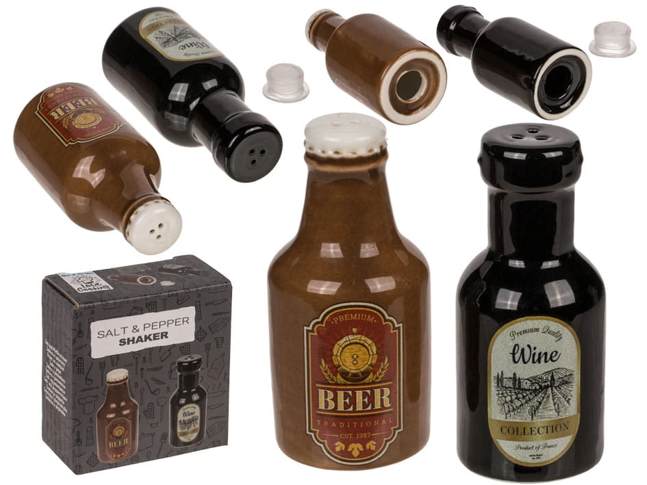 Solniczka i pieprzniczka w formie butelek piwa i wina to zabawne i stylowe dodatki do Twojej kuchni. Wykonane z ceramiki, są nie tylko praktyczne, ale również dodają uroku Twojemu stołowi. Solniczka w kształcie butelki wina i pieprzniczka w kształcie butelki piwa to idealne towarzystwo na stole podczas przyjęć. Ich wyjątkowy design sprawi, że codzienne gotowanie stanie się bardziej wesołe i eleganckie.