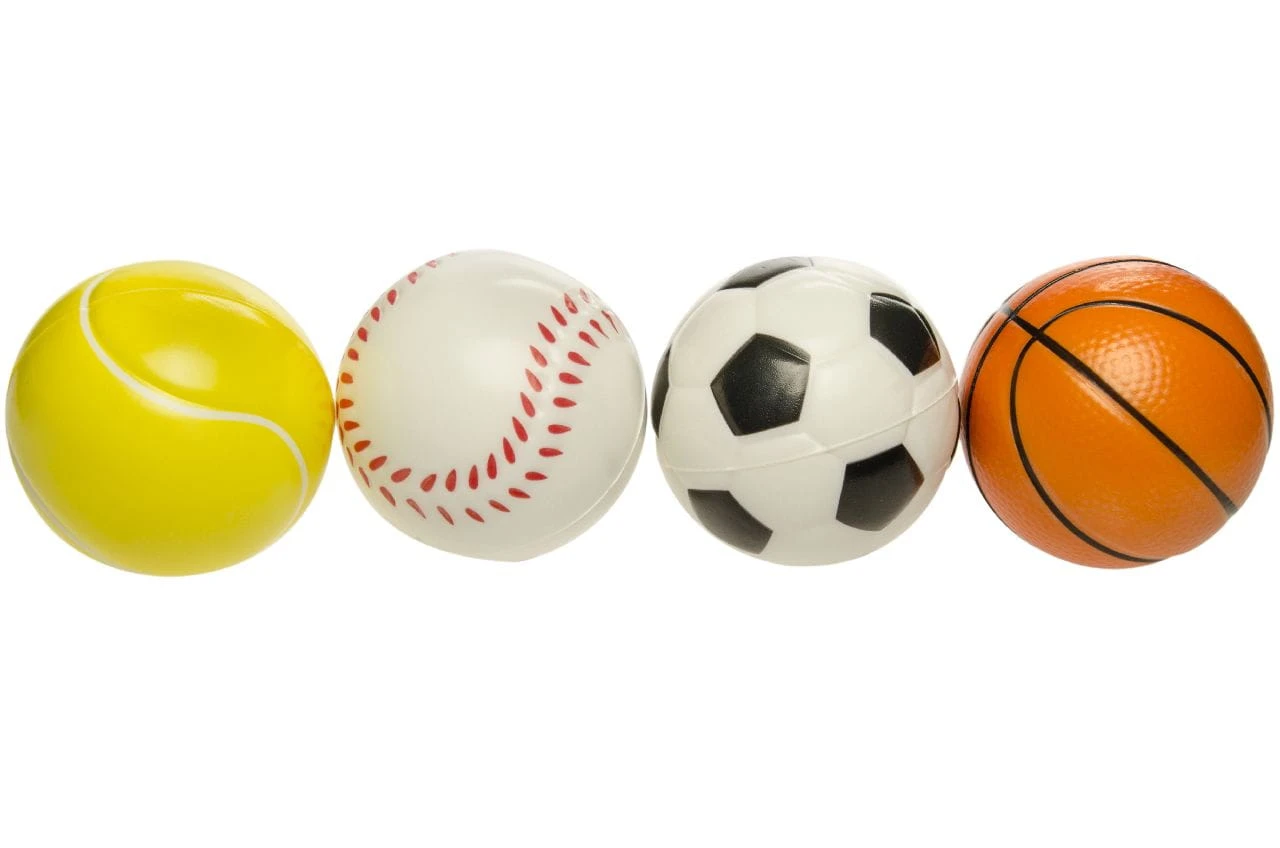 Piłeczki do ściskania, rzucania, odbijania w czterech sportowych wzorach. Kolorowe, z miękkiej gumy. uwielbiane przez wszystkie dzieci. Sprzedajemy jako mix wzorów.