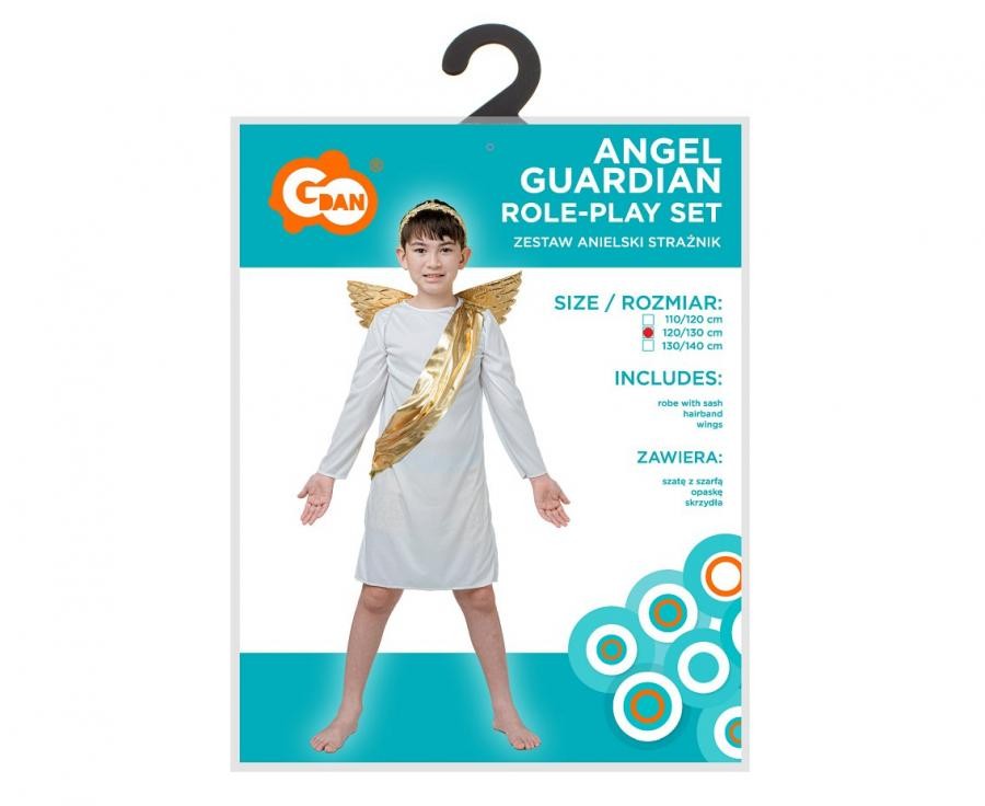 Strój Aniołka, Anielskiego Strażnika dla chłopca w rozmiarze 120/130 cm to magiczny kostium, który pozwoli każdemu dziecku wcielić się w rolę niebiańskiego opiekuna. W zestawie znajduje się biała szata ozdobiona elegancką, złotą szarfą, efektowne skrzydła oraz delikatna opaska na głowę, które razem tworzą pełen uroku i wyjątkowego charakteru strój.