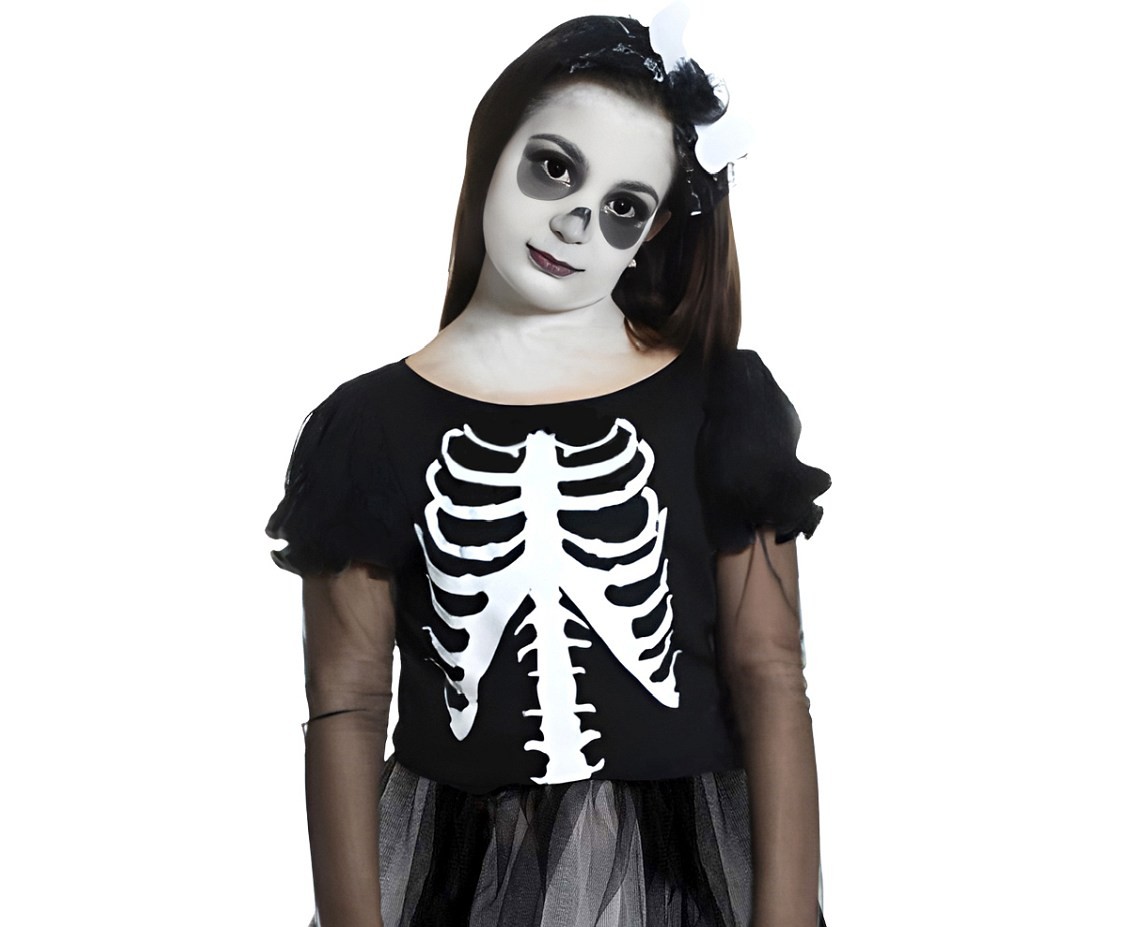 Strój Dziewczyna Kościotrup to wyjątkowy kostium dla dziewczynek, które chcą połączyć mroczny klimat Halloween z dziewczęcym urokiem i elegancją. Kontrast czerni i bieli podkreśla halloweenowy charakter, a tiulowa spódnica dodaje lekkości i stylu, tworząc efektowny i zabawny wygląd.