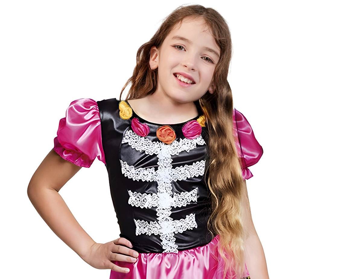 Sukienka wykonana jest z połyskującego materiału w odcieniach różu, pomarańczu i żółci, ozdobiona czarnymi akcentami i koronką. Dzięki temu kostium jest nie tylko upiorny, ale też uroczy – idealny dla małych fanek przebieranek. Wygodny krój i miękkie tkaniny zapewniają komfort nawet podczas długiej zabawy.