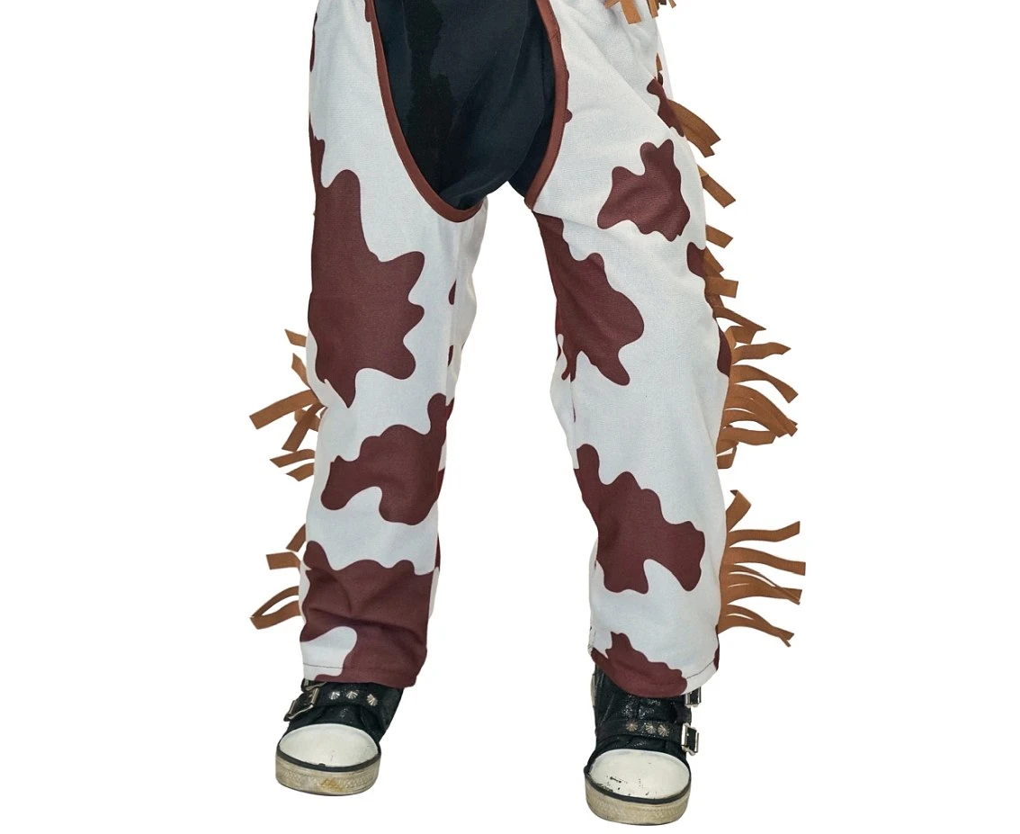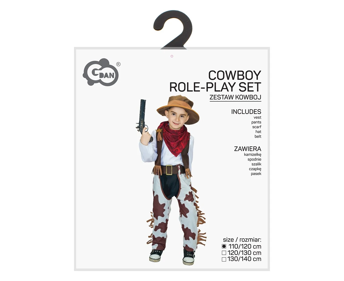 Zestaw zawiera kamizelkę, spodnie, szalik, czapkę oraz pasek, dzięki czemu dziecko od razu może wcielić się w rolę dzielnego kowboja. Połączenie kolorów białego i brązowego nadaje kostiumowi autentycznego wyglądu. Lekki i wygodny materiał zapewnia komfort i swobodę ruchu podczas zabawy.