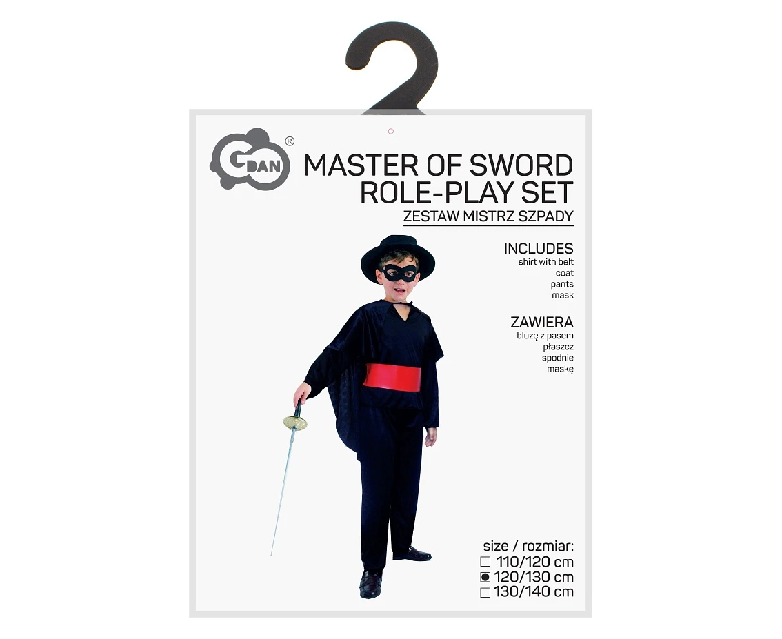 Strój Mistrza Szpady to wyjątkowy kostium dla dzieci w rozmiarze 120/130 cm, idealny dla małych bohaterów i poszukiwaczy przygód. W skład zestawu wchodzą efektowny płaszcz, wygodne spodnie, czarna bluza oraz tajemnicza maska, które razem tworzą niepowtarzalny wygląd prawdziwego mistrza szpady.