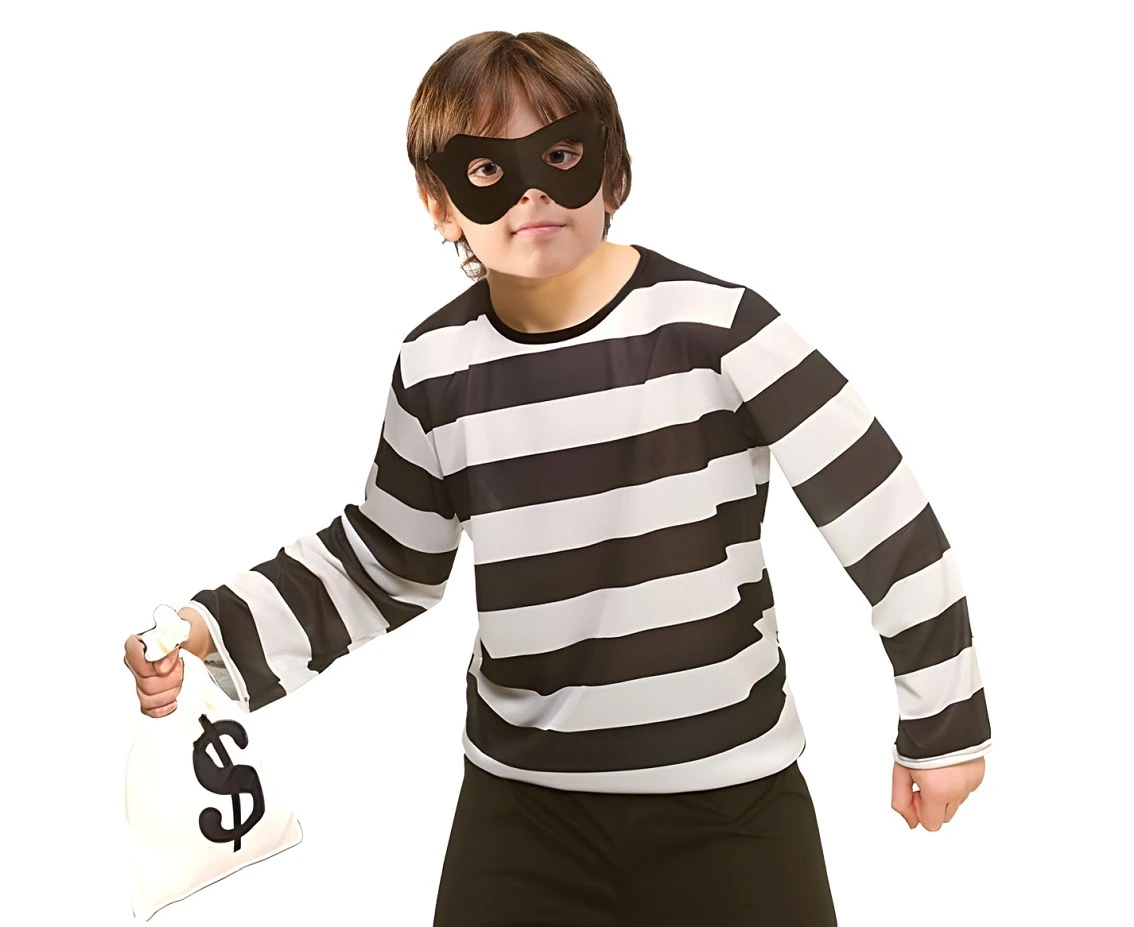 Strój Złodzieja dla chłopca to oryginalne i zabawne przebranie, które natychmiast przyciąga uwagę podczas Halloween, balów karnawałowych i przedstawień szkolnych. Klasyczne czarno-białe pasy, maska na oczy i charakterystyczny worek z dolarem sprawiają, że każde dziecko może wcielić się w sprytnego rabusia z filmów i bajek.