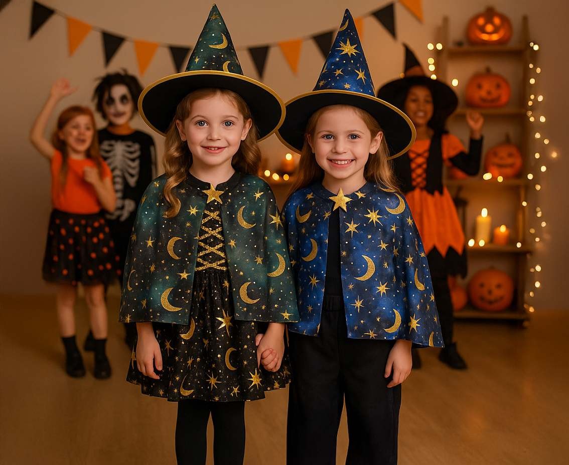 Zamień swoją małą czarodziejkę w bohaterkę magicznej opowieści! Ten uroczy zestaw składający się z peleryny i kapelusza to doskonały wybór na bal przebierańców, Halloween, karnawał lub codzienną, twórczą zabawę w domu.