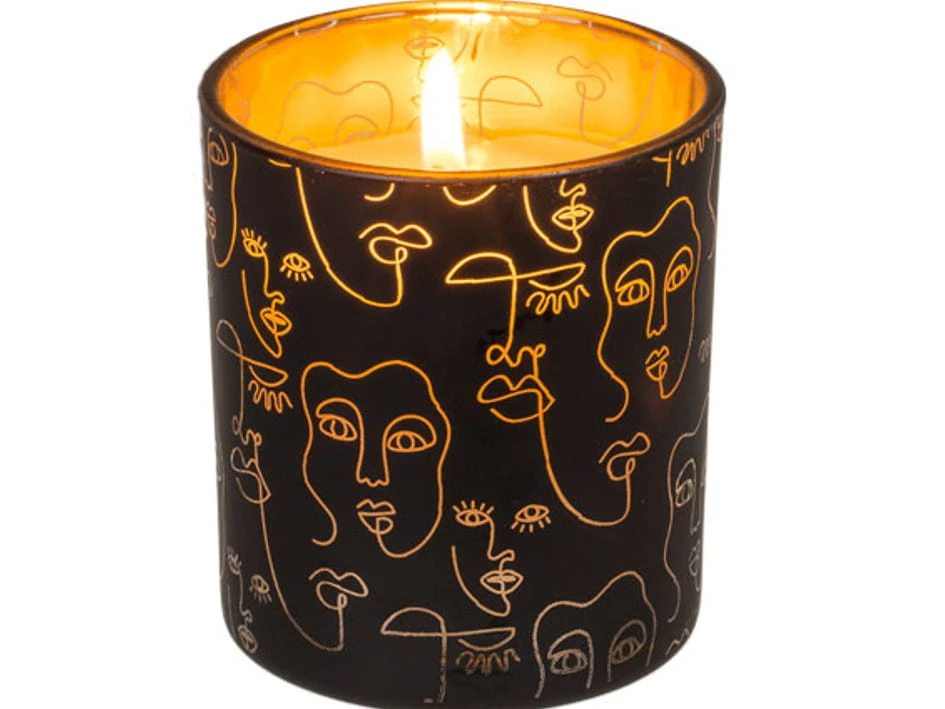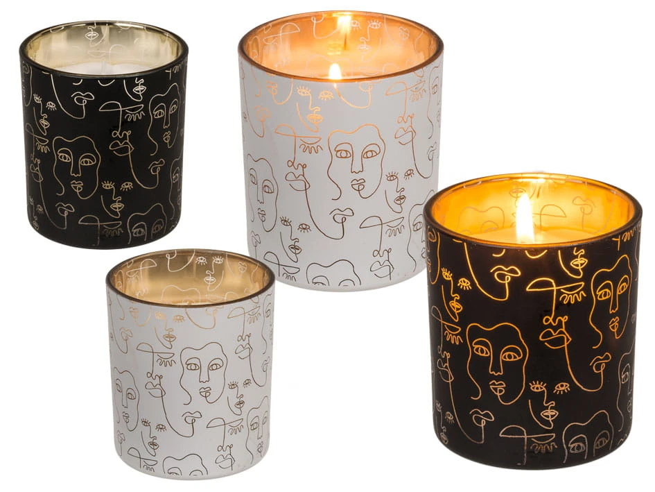Bardzo ładna świeczka dekoracyjna - fantastyczna na prezent. Świeczka w słoiczku, czarna lub biała z wzorami twarzy w stylu abstrakcyjnym. Wymiary świeczki: 8 x 7 cm. Pomysł na prezent i dekorację w mieszkaniu.