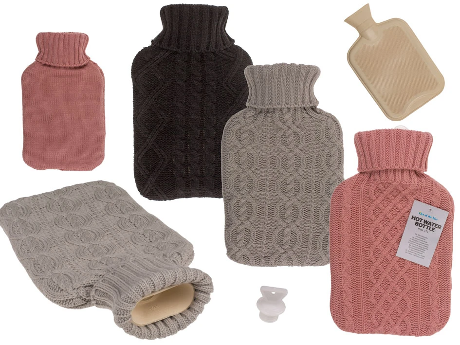 Elegancki termofor 1,7 l z miękkim, plecionym pokrowcem. Idealny na zimowe wieczory, łagodzi ból mięśni i zapewnia przyjemne ciepło.