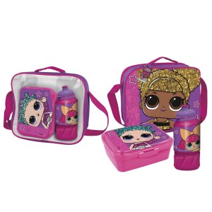 Bardzo użyteczna torba na lunch dla dziecka we wzorze z lalkami LOL. Torba posiada regulowany pasek, aby wygodnie móc ją zawiesić na ramię. Zapinana na suwak. W zestawie kolorowy bidon oraz pudełko na np. kanapkę lub dowolną przekąskę.
