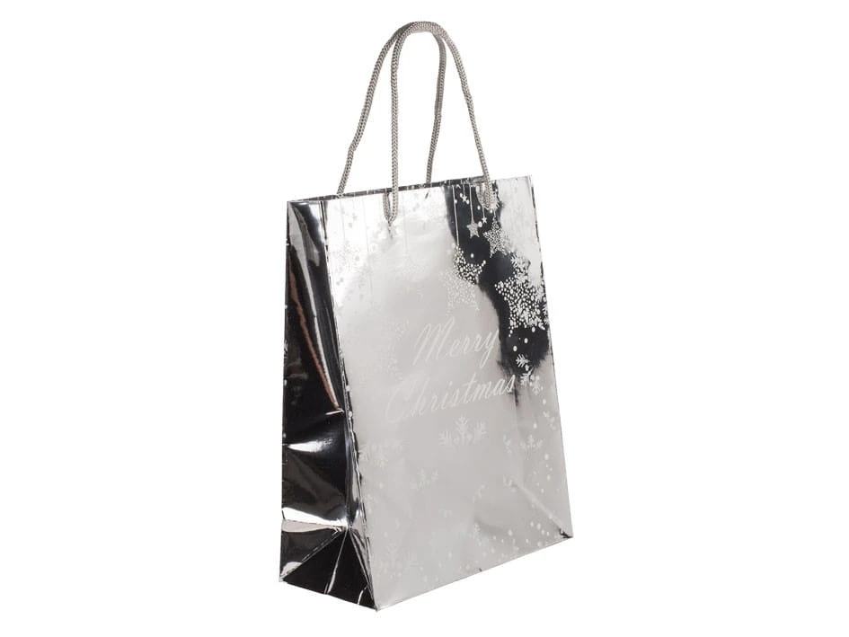 Ta piękna torba prezentowa Merry Christmas to mieszanka dwóch wyjątkowych wzorów: złotego i srebrnego. Jej metaliczne kolory z subtelnym połyskiem dodają jej elegancji i świątecznego blasku. Z wymiarami 18 x 8 x 23 cm jest wystarczająco przestronna, aby pomieścić prezenty i sprawić, że Twój prezent będzie wyglądać jeszcze bardziej uroczo pod choinką. To idealny sposób na dodanie magicznego akcentu do Twojego świątecznego prezentu.