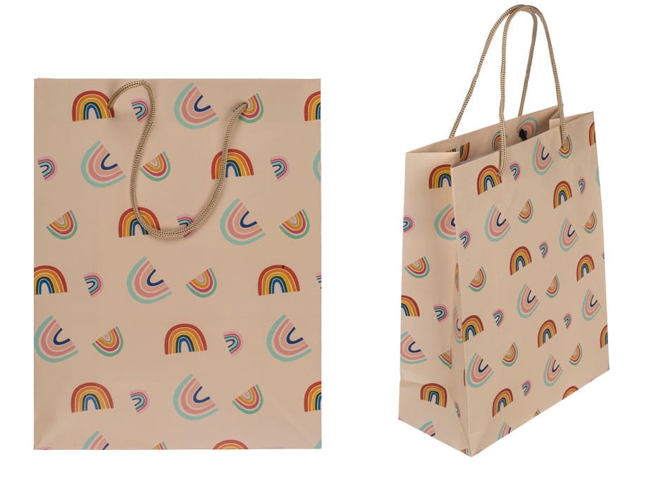 Bardzo ładna kremowa torba prezentowa z ciekawą grafiką przedstawiającą tęcze. Na każdą okazję. Torba osiąga wymiary: 18 x 8 x 23 cm