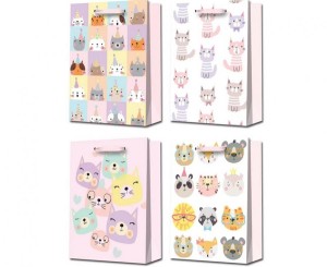 Papierowa torebka prezentowa ze zwierzątkami 32x26x16 cm. Uroczy wzór, szerokie dno, idealna na prezent dla dzieci i dorosłych. Mix wzorów.