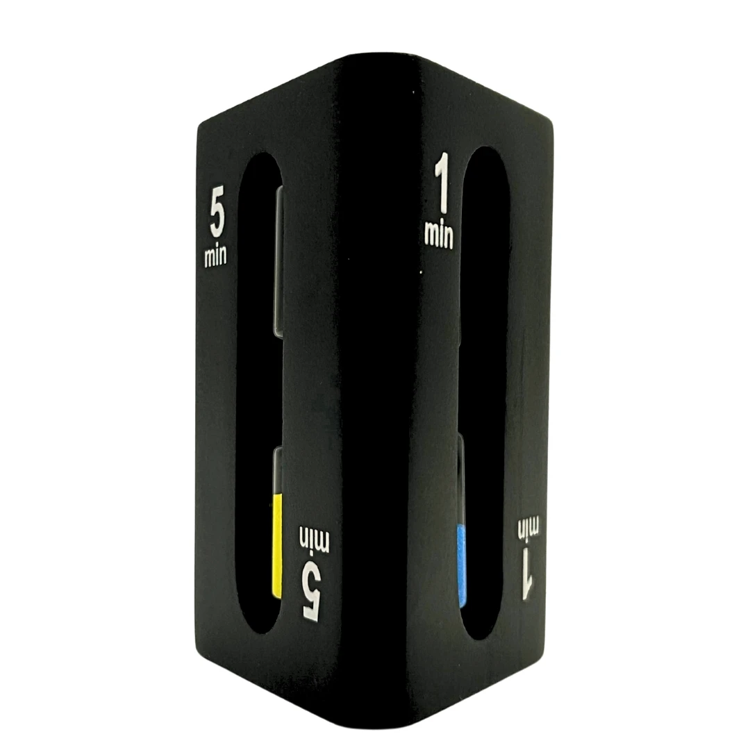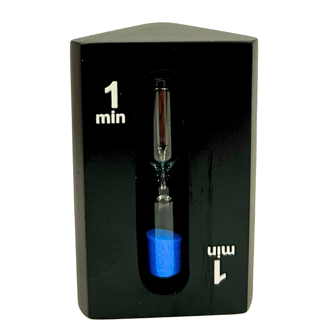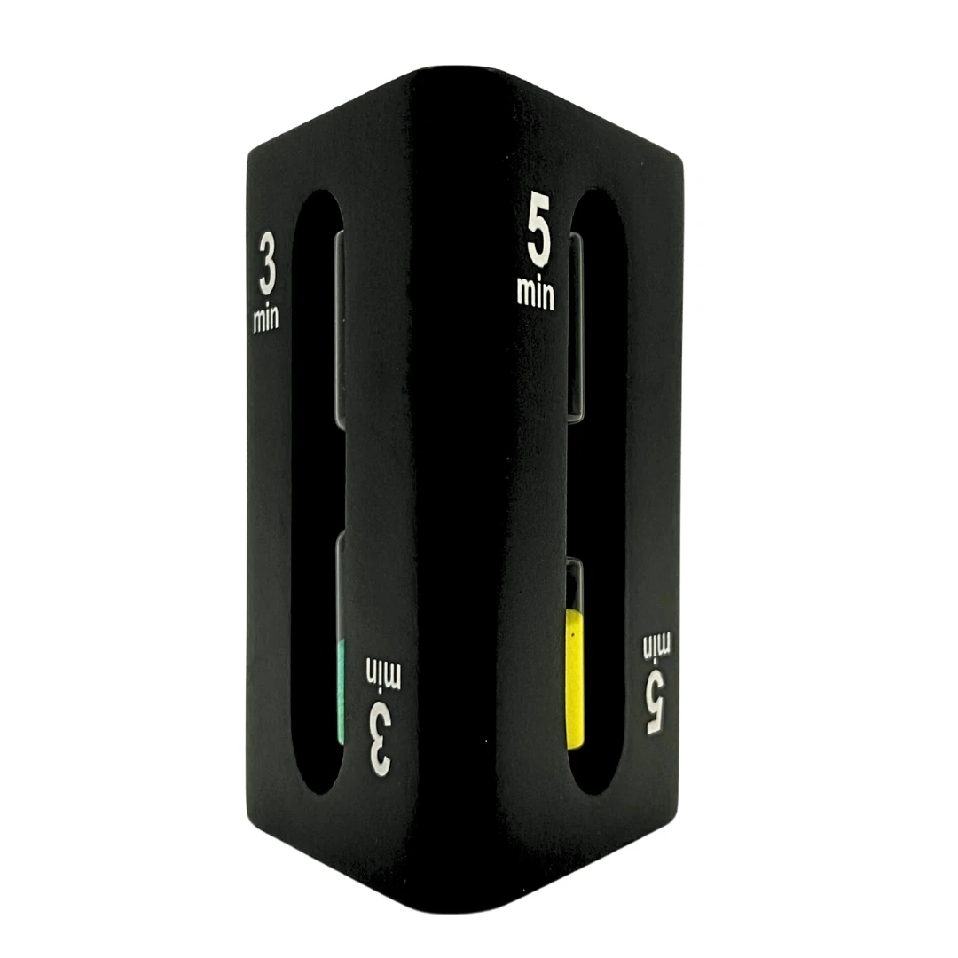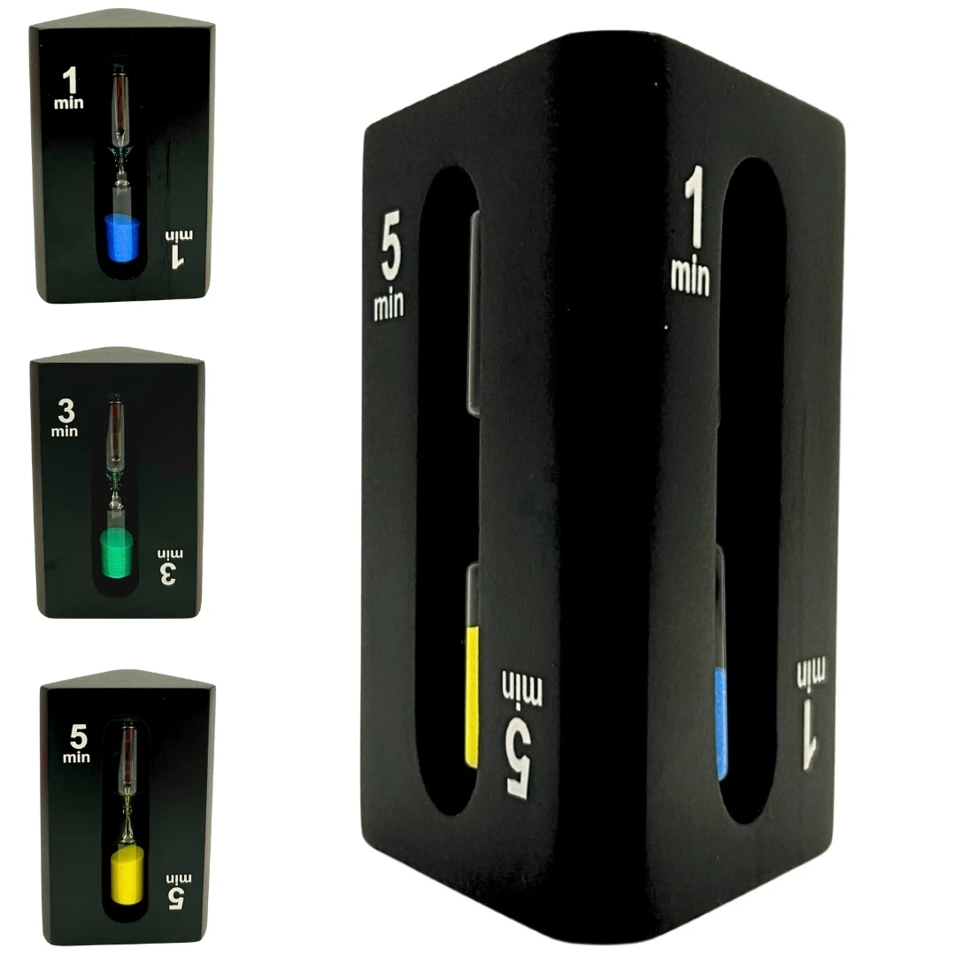 Nowoczesna trójstronna klepsydra 1–3–5 minut w czarnej obudowie. Stylowy timer bez elektroniki do pracy, nauki i relaksu.
