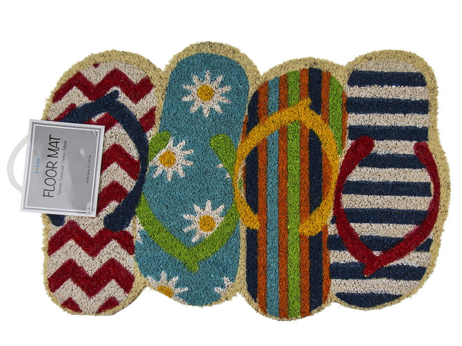 Duża wycieraczka wykonana z wytrzymałego, szorstkiego włosia skutecznie zatrzymuje brud, piasek i inne zanieczyszczenia z obuwia, pomagając utrzymać czystość w domu. Oryginalny kształt czterech klapków oraz radosny motyw sprawiają, że już od progu wnętrze nabiera ciepłego i przyjaznego charakteru. To idealne połączenie funkcjonalności i humorystycznego designu.