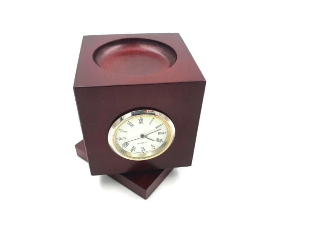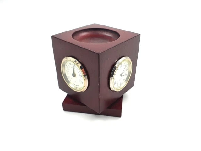 Bardzo użyteczny gadżet na każde biurko - elegancki zegar na biurko z termometrem i higrometrem. Wykonany z drewna ze wskaźnikami na 3 ścianach bocznych. Super pomysł na prezent.