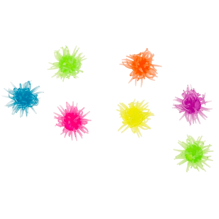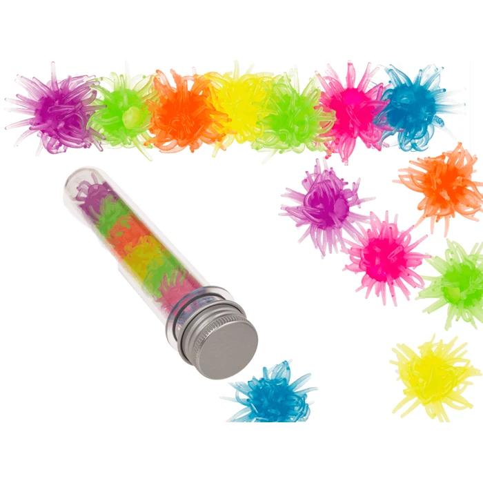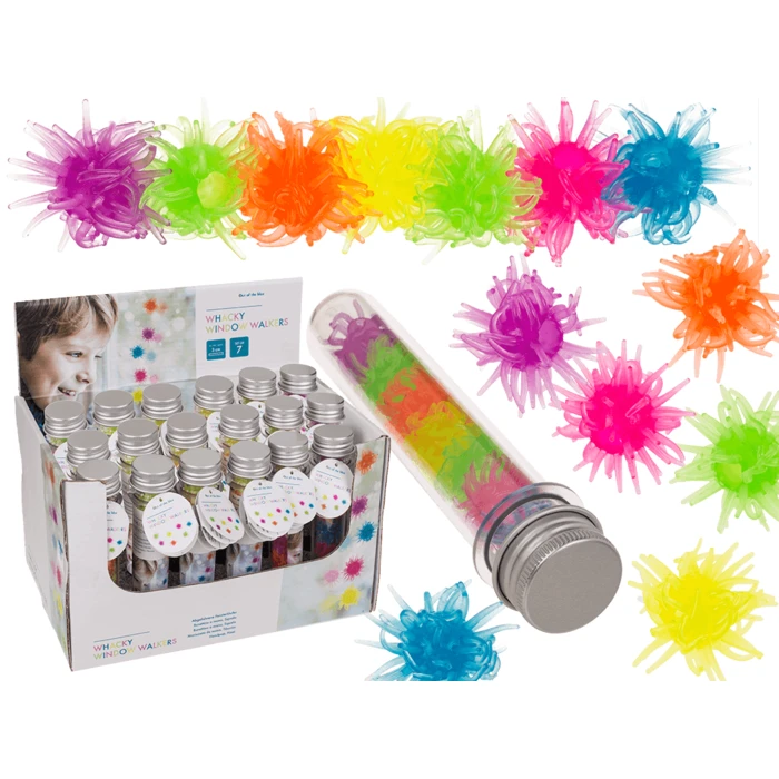 Zabawka Whacky Window Walkers w tubie. Whacky Window Walkers to zabawki uformowane z lepkiego elastomeru, które rzucone przyklejają się do powierzchni. W tubie znajduje się 7 Whacky Window Walkers w różnych kolorach.