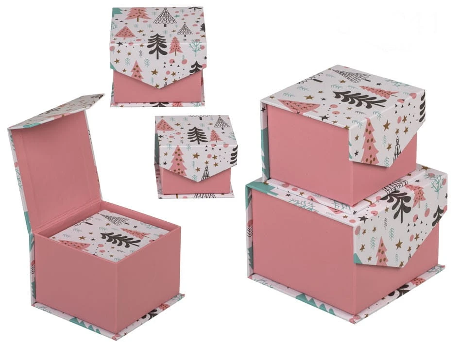 Każdy zestaw zawiera dwa kwadratowe pudełka zamykane na magnes Tekturowe pudełka idealnie nadają się na pakowanie prezentów. Każde kolejne pudełko jest włożone w poprzednie. Idealne na pakowanie podarunków. Wymiar pierwszego 10 x 10 x 7 cm, drugiego 8 x 8 x 6 cm.