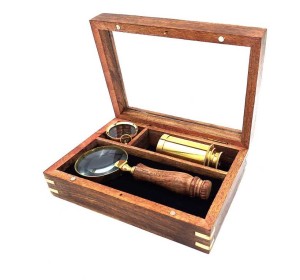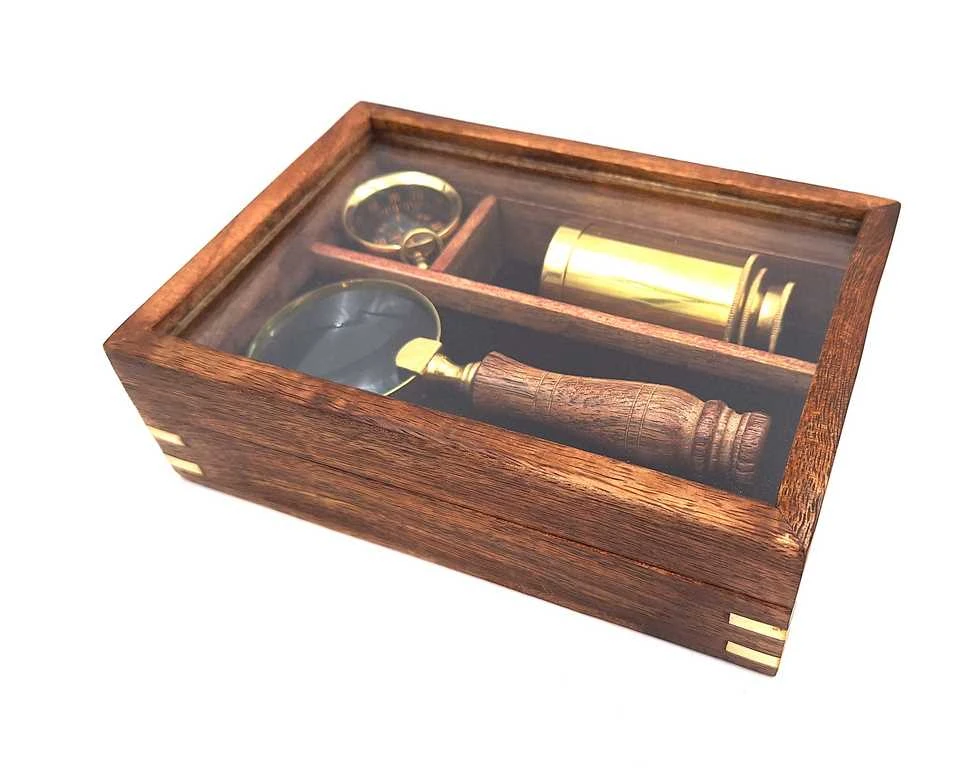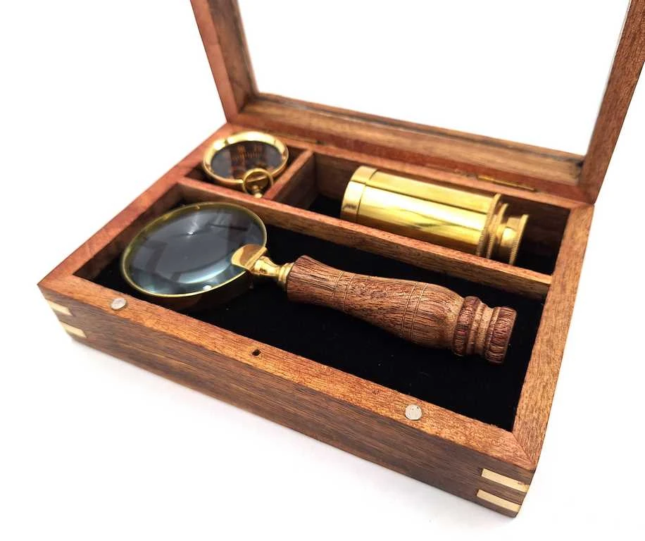 Zestaw Podróżnika – Lupa, Kompas i Luneta w Drewnianym Pudełku