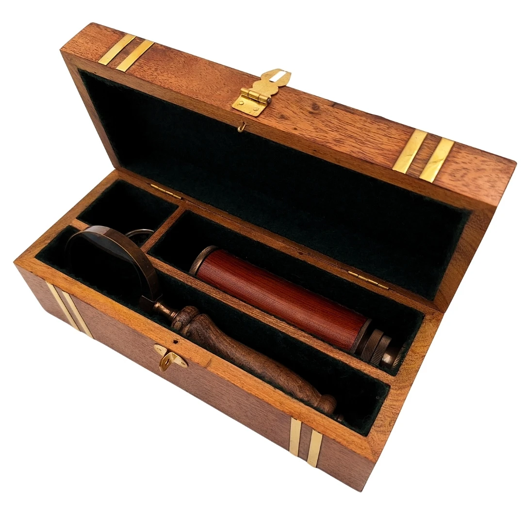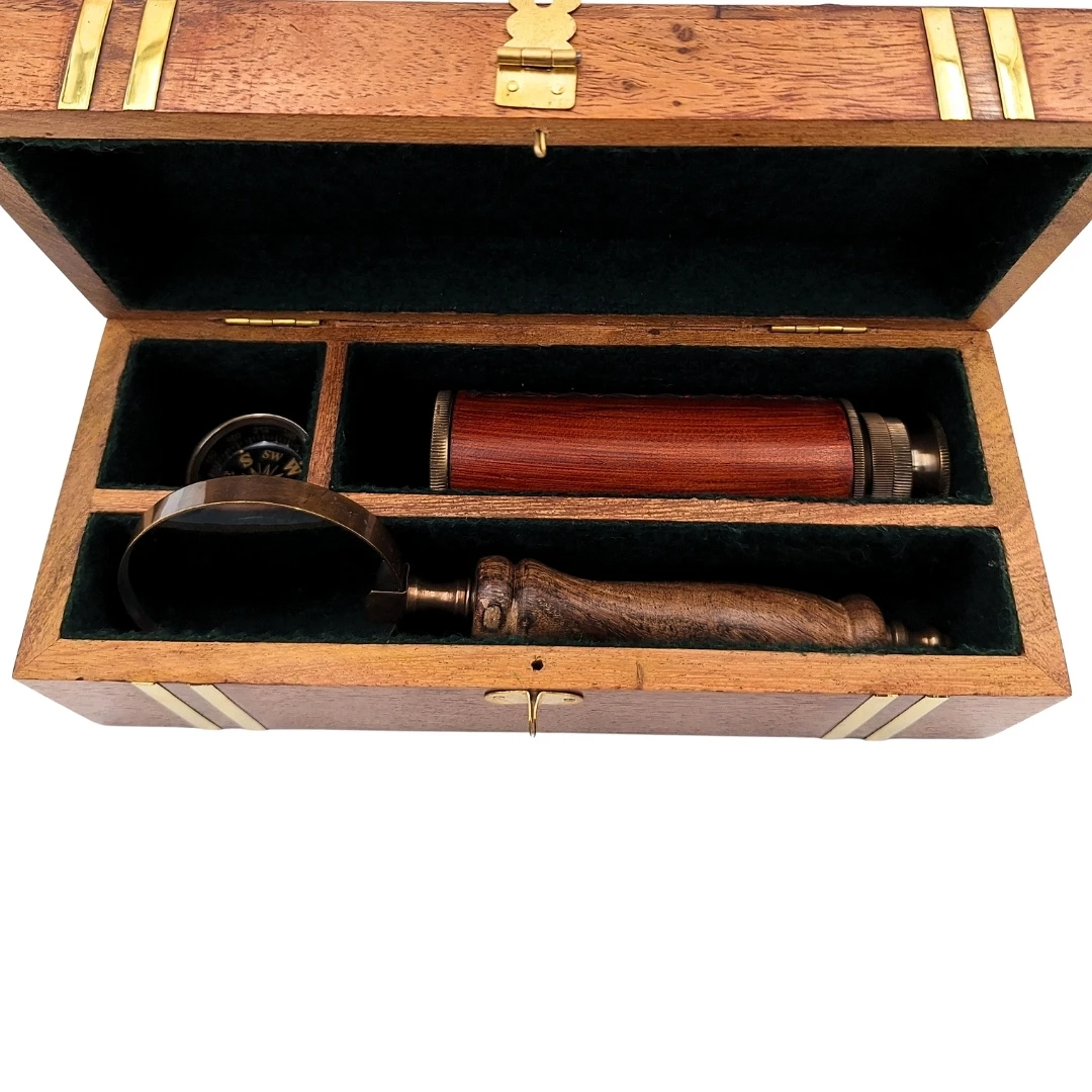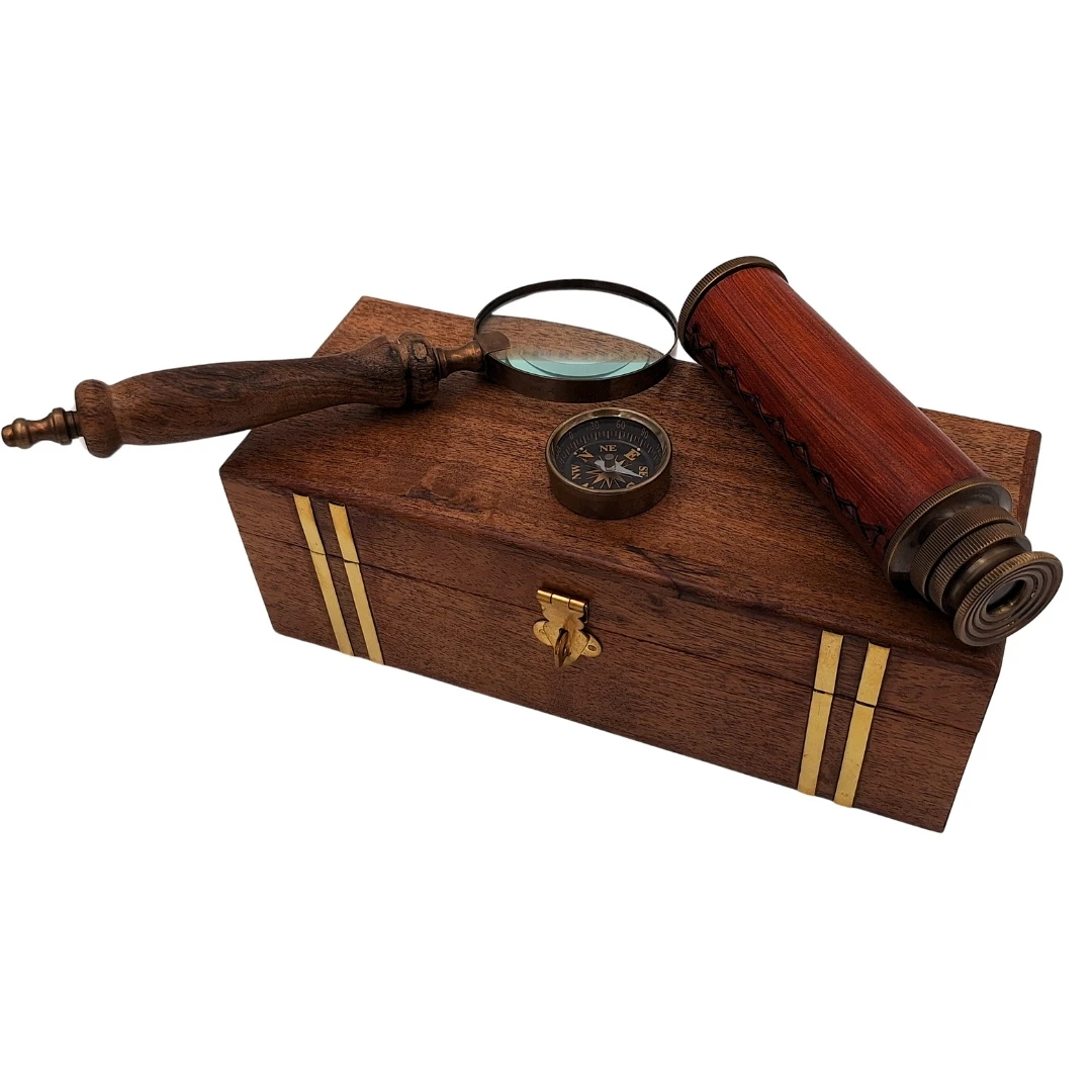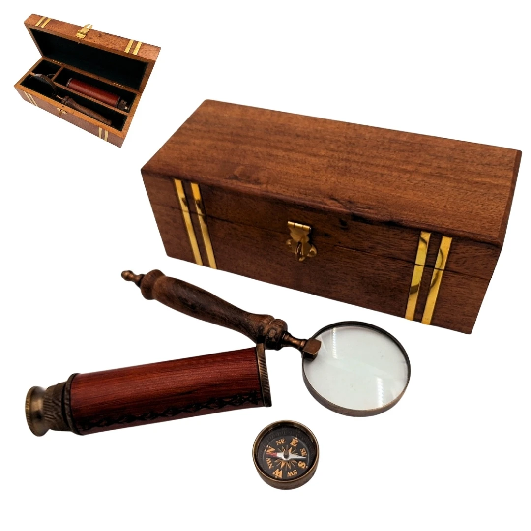 Zestaw Retro Podróżnika – Luneta, Kompas i Lupa w Drewnianym Pudełku