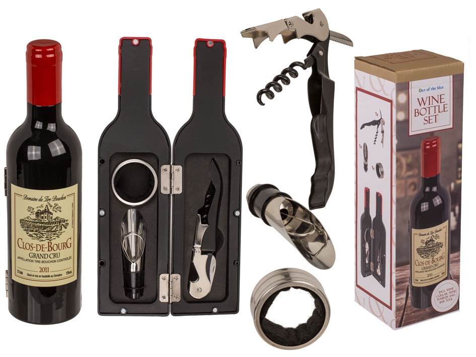Elegancki zestaw akcesoriów do wina w etui w kształcie butelki. 3 elementy: otwieracz, nalewak i obrączka. Idealny prezent dla miłośników wina.