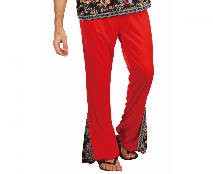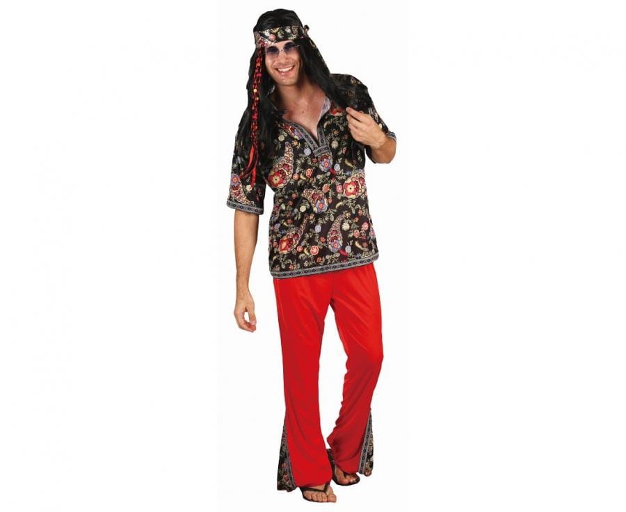 Strój "Czerwony Hipis" to doskonały wybór dla mężczyzn, którzy chcą dodać odrobinę barwnej energii każdej imprezie. Zestaw składa się z wyrazistej, czarno-różowej bluzki ozdobionej żywymi wzorami oraz czerwonych spodni z szerokimi dzwonami na nogawkach, co idealnie odwzorowuje charakter lat 60. i 70. Stylizacji dopełnia kolorowa opaska na głowę, która podkreśla styl boho i swobodę ducha.