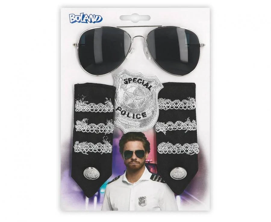 Zawartość zestawu: okulary, odznaka, pagony