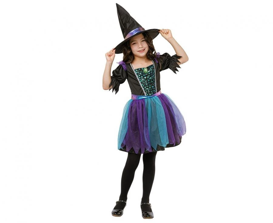 Twoje dziecko marzy o wcieleniu się w tajemniczą czarodziejkę? Strój Gwiezdnej Czarownicy to idealny wybór dla małych miłośniczek magii, które chcą zabłysnąć na każdej przebieranej imprezie. Elegancka sukienka z błyszczącymi cekinami i zwiewną spódnicą w kolorach czerni, fioletu i turkusu sprawia, że strój prezentuje się niezwykle efektownie. Dodatkowym atutem jest klasyczny czarny kapelusz, który nadaje stylizacji charakterystycznego wyglądu.