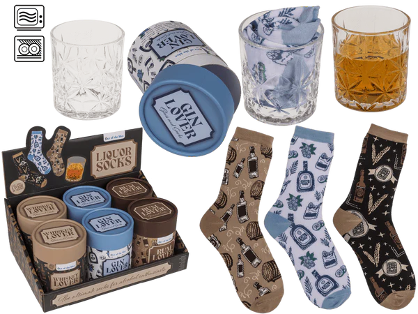 Zestaw prezentowy: szklanka 280 ml i skarpetki z motywem alkoholu. Stylowy, humorystyczny upominek w ozdobnej tubie, gotowy do wręczenia.