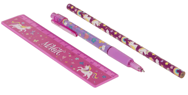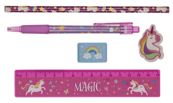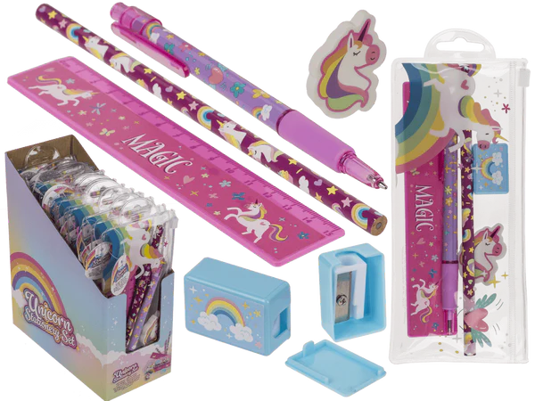 Magiczna nauka z Jednorożcem! Zestaw 5 przyborów szkolnych z tęczowym motywem: ołówek, długopis, linijka i więcej. Idealna wyprawka na prezent. Sprawdź!